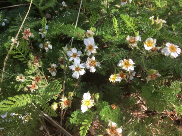 In 2015 I was in the Sierra foothills south of here, and first learned of this plant below, called Bear Clover or Mountain Misery, Chamaebatia foliolosa. Back then we were in the same sort of dry terrain at a similar elevation, so I wasn’t surprised to see it again. Last week I couldn’t remember the name, but I recalled something about it being smelly.