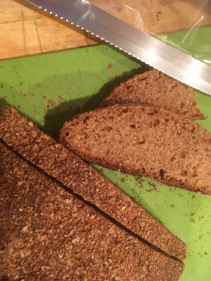 Mabel has not stopped making bread, and she fed me two kinds — first a hearty no-knead oatmeal stout bread baked during my visit. Then sourdough rye from a Tassajara Bread Book recipe; she sliced a good portion of that loaf into a ziploc for me to take on my journey home. I can’t remember ever eating anything like that bread, each fat slice sustaining enough to the body and soul that a single one would have done for a meal — but orange zest, caraway and other seeds combined in a flavor whirl that made me unwilling to wait for the next meal to have that experience again.