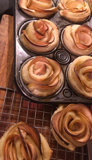 And I helped the children make these puff-pastry goodies I saw a video recipe for on Facebook. They are pretty but not very tasty, because the pastry dough in the bottom of the muffin cups can’t puff, and comes out too dense and doughy. But it was fun, and they look pretty!