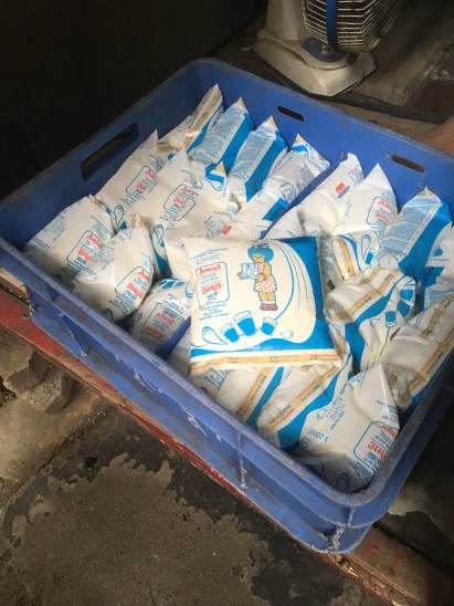 Because Kate doesn’t trust the regulators of these little dairies, she buys milk in aseptic boxes, or cartons of pasteurized. But most Indian households take milk home from little shops that get it fresh daily in half-liter plastic bags, such as I saw when I went out shopping with Kareena. This smiling lady was just receiving the morning’s shipment. Kareena says they boil the milk in a pot when they get it home, and store it in the fridge in the same pot, which they don’t use for any other foods, I think mostly so that the flavors of chili and cumin won’t get into the milk.