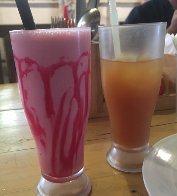These are two of my favorite exotic flavors. Back home, I have made an Indian tapioca pudding flavored with both. So when I had a choice of kulfi flavors, I chose pistachio. And the same weekend, after our sweaty stairclimbing hike we stopped in an eclectic restaurant called The German Bakery, where I saw on the menu a Turkish Rose shake. Without a doubt I would order that! And I drank two lemon ginger iced teas as well — I was a little dehydrated and they were small, after all.