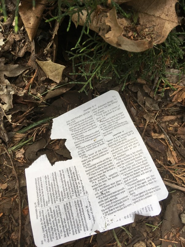 I wanted to read every wrinkled page of the Bible I picked up, because I was sure there were pertinent messages there… but of course I couldn’t, and I just brought them all home for a more honorable disposal. Eventually the evidence added up to three copies of the little orange Gideon New Testament with Psalms and Proverbs that had been torn and tossed.
