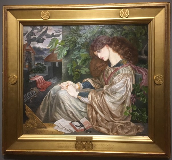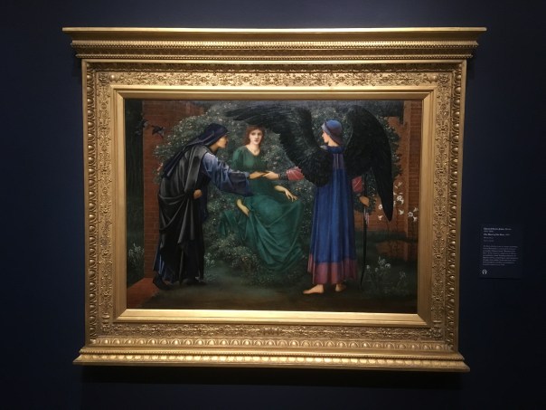 I didn’t read up on the subject beforehand, of the Pre-Raphaelite Brotherhood as a group of young enthusiasts named themselves in 1848, and what their concerns were. Lorica gave me some background on the drive down, and there was a lot of help to be had by reading the descriptions of each piece of art. One phrase that I read more than once was jewel tones. This term echoed in my mind as I walked through the exhibit and provided one idea to help me see a little better.