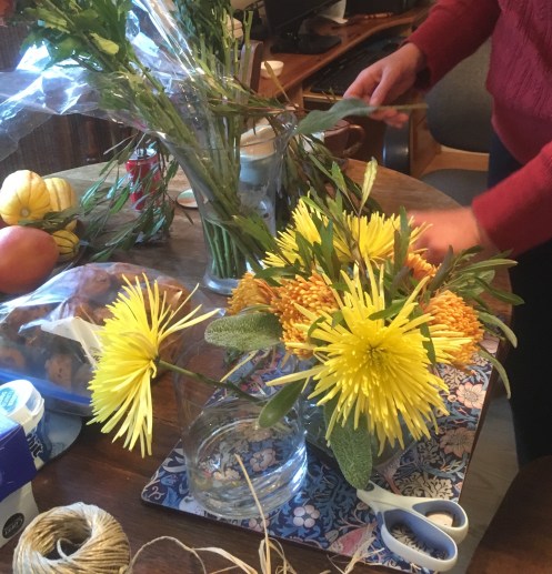 Until Wednesday, the smoky and cold air had continued to hang over our county oppressively. Then RAIN, glorious and cleansing, fell from the skies, and overnight the Air Quality Index fell from the 160’s (similar to what I experienced in Mumbai last winter) to below 20. All day Pearl and I baked pies, and yams in orange sauce, and prepped the turkey dressing. With the rain came milder temperatures overall, so we had to leave the door and windows open at times to vent all the oven and stovetop heat, and for two days we had the comforting background music of steady pattering and drumming. Pearl took lambs’ ears and dodonea from my garden to add to spider mums from Costco and created table decorations for the feast.