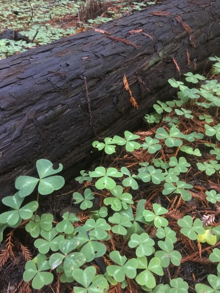 I learned that the lichens that hang from the trees like tresses are lichen fruticose, and that the needles in the tops of the coast redwoods (Sequoia sempervirens) resemble those of their cousins the giant redwoods (Sequoiadendron giganteum) that grow naturally in the Sierra Nevada. Big leaf maple and hazelnut trees made splashes of light and color in the groves that were dark in midday, the close canopy blocking the light from way up there. We made little impact on the deep quiet of the woods, strolling on the duffy paths — but that atmosphere was broken by a big crash and boom, the sound of a tree falling somewhere in the park. If everything hadn’t been thoroughly wet, we’d surely have seen some dust raised by that event.