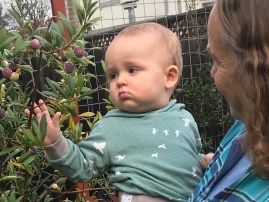 Raj and his parents have returned to the other side of the globe. Our last few days, which were quieter after all the fun aunts and uncles and cousins had gone, provided more opportunity for the two of us to wander about the garden between showers, to examine sunflower seeds and olives and salvia flowers; and for Raj to eat peanut butter for the first and second times.