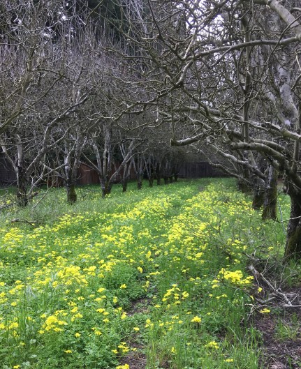 I didn’t make my exit, though, until I’d also explored as far as the two rows of apples on the other side of the lot. This part of the county resembles the fields and vineyards I’m used to, in that yellow flowers are brilliant right now, between rows of trees or grapes, or along roadsides. But instead of the usual mustard, here there was sourgrass (oxalis) blooming for miles and miles.