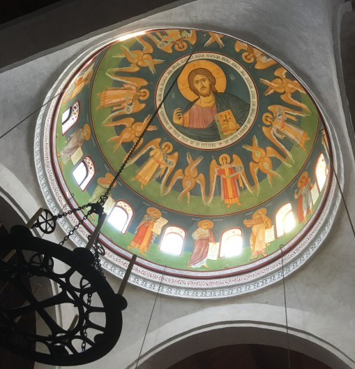 Below is the text as we sing it in my parish, and here: The Great Doxology, is a video I found, if you would like to hear it sung, not too differently from what I’m used to. Of course, every parish and every choir does it uniquely, and I like the way we sing it the best.  🙂  This morning I was sitting on the other side of the cathedral from my usual, and enjoyed the perspective on the dome and the icon of Christ Pantocrator, with the words in the encircling border: “He hath looked out from His holy height. The Lord from heaven hath looked upon the earth, to hear the groaning of them that be in fetters.”