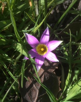 Besides the plants I’ve pictured here, I saw Blue Dicks; a yellow flower called Pacific Sanicle; Henderson’s Shooting Star; and a tiny and tightly furled white flower among leaves also folded close, but looking like clover — the app could make no sense of that one. But the most interesting meeting was of the Rosy Sandcrocuses. I saw most of them almost hidden in the grass, they were down so low, but this one had opened while still lying in its sand bed. Those long grass blades lying next to it are its leaves, which makes you understand why some people call it Onion Grass.
