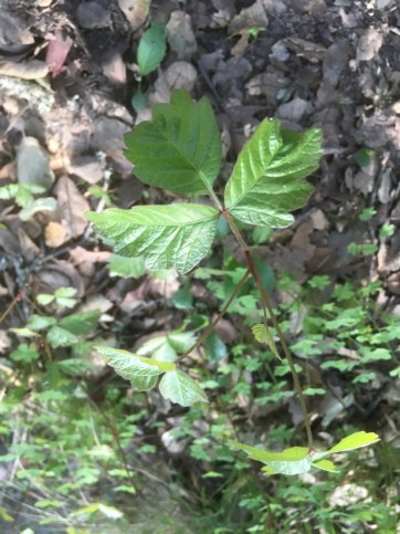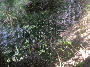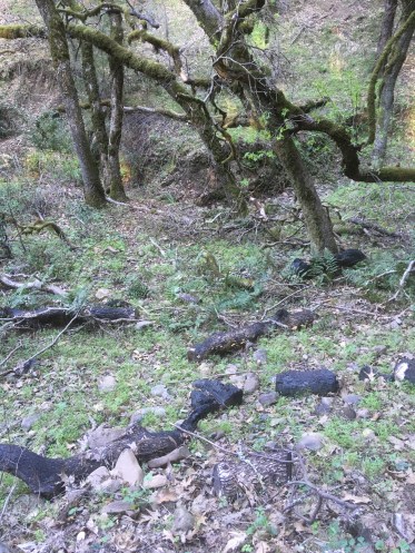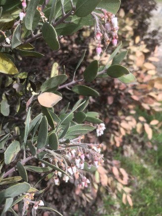 The fires of last fall ripped through this area — that’s two years more recent than where I hiked on Tuesday, and the damage is striking. So many manzanitas are black, or black with copper leaves. But these wind-driven fires we’ve had will thoroughly burn one bush or tree and leave one right next to it unharmed. In the next picture I was trying to show the flowering bush, and the other close by that is singed and stressed. Maybe it will recover by next year – or maybe not.