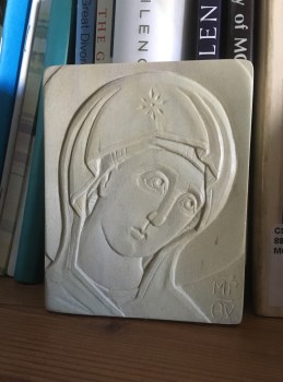Then one day, I think it was in 2019, I happened to see on Facebook this stone icon of the mother of Christ, carved by Jonathan Pageau, and it was available. I hadn’t been looking, and it wasn’t up very long; now I wonder if God didn’t arrange the whole thing, knowing that I would never finish my project if He didn’t put her right in front of me. Later I thought how natural it is that she would be the subject of sacramental art in my garden, she who was certainly in that historic garden 2,000 years ago — the place where her Son revealed Himself to have conquered death, and where women first discovered the empty tomb.