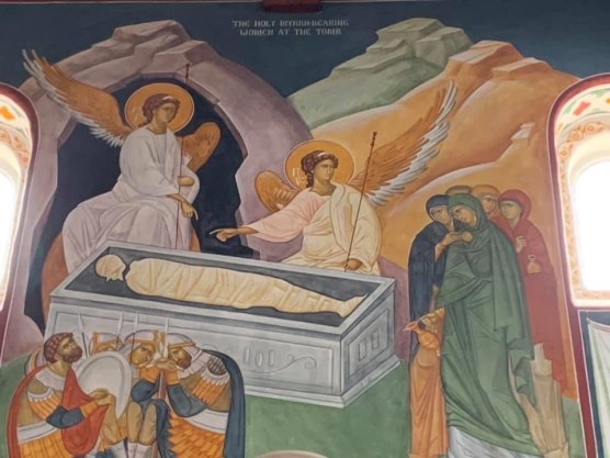 It was nearly on the eve of Myrrhbearers’ Sunday that he let me know he was ready, and he came with his older son to install it. Their appreciative sharing of my natural paradise for an hour was added joy for all of us. O glorious day! And now, though the beautiful plants will bloom and fade, come and go with the seasons and years, this reminder of permanent and heavenly realities is finally here, and I feel that my garden is complete.