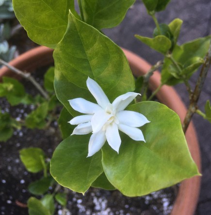Okay, enough entomology for today. Here is that flower I promised you. It is my Belle of India jasmine that Soldier and Joy gave me for Christmas one year. It’s taken me a while to figure out how to make it happy, but now it is healthy and blooming and so sweet! I wonder if any Bombini will come by for a taste?