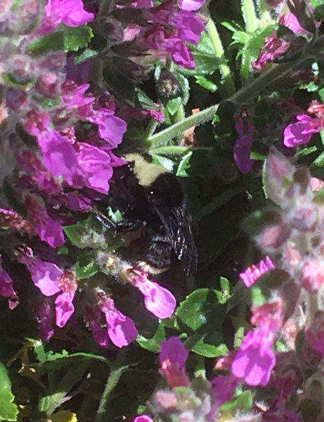 One morning this week I went back and forth along the front walk, for fifteen minutes or so, stooping over the germander hedges to watch a bumblebee. It caught my eye because of its yellow markings that were not what I’m used to seeing, and also because of its nectar-gathering style.