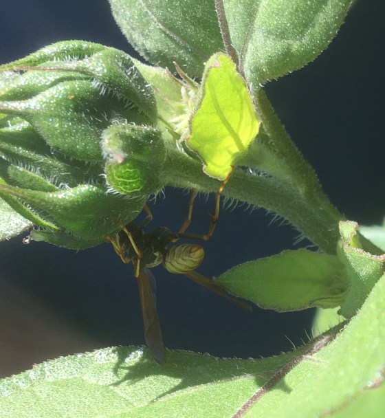 **Still seeing butterflies and wasps that I don’t know, and which I can sometimes identify. These wasps that my Seek app says are paper wasps ignore the sunflowers that are open, and hang out on the fat buds. I wonder what they are doing…