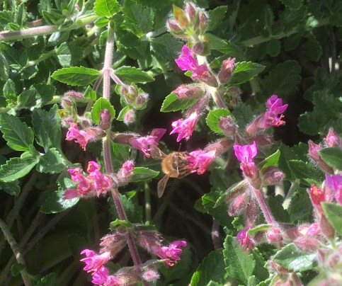 I took a slow-motion video of the bees out front on the germander (teucrium). In real time they seem very excited, almost frantic, in their buzzing from flower to flower, but when I watched the video it showed their true selves as purring bee-copters taking all the time in the world, that is, the whole day and their whole short lives, to do their work.