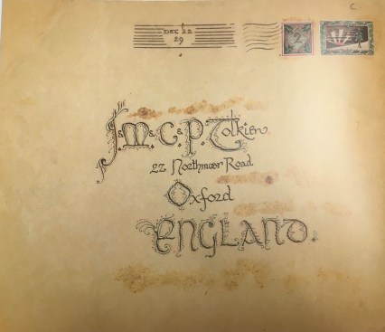 The text of the 1935 letter above reads: “[North Polar Bear] says that we have not seen the last of the goblins — in spite of the battles of 1933. They won’t dare to come into my land yet; but for some reason they are breeding again and multiplying all over the world. Quite a nasty outbreak. But there are not so many in England, he says. I expect I shall have trouble with them soon.