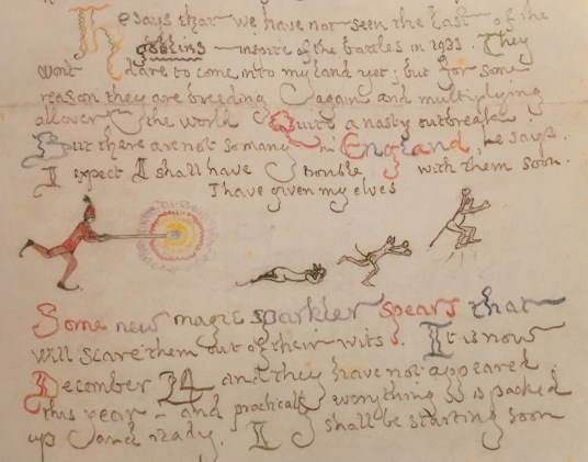 “I have given my elves some new magic sparkler spears that will scare them out of their wits. It is now December 24, and they have not appeared this year — and practically everything is packed up and ready. I shall be starting soon.”