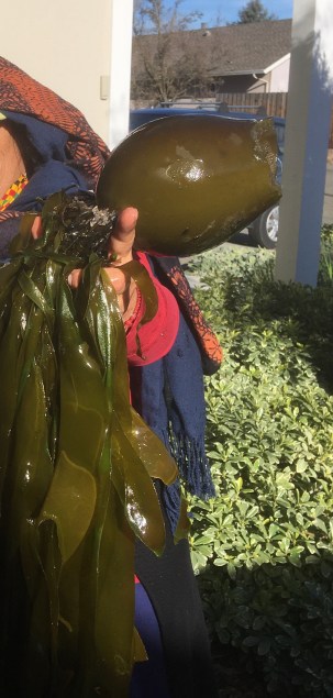 Then back to the kelp, where as neither of us had any other tool, Bella used a stick of driftwood to hack the bulb and leaves from the “rope” of the sea vegetable, and we put the parts we wanted in a plastic bag. We stopped by my house to wash the sand off outdoors, after checking online about the edibility of it. This Nereocystis is also known as bullwhip kelp, ribbon kelp, and bladder wrack.