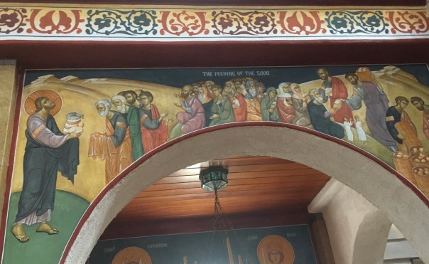 Christ in the House of Mary and Martha in Bethany (on the other side of the arch, not pictured, is Martha scowling) makes me want to imitate Mary and sit at Jesus’s feet. And The Feeding of the Five Thousand reminds me of various levels of meaning in the lines of the Lord’s Prayer, “Give us this day our daily bread.” As we are going without physical food in various ways during this season, that part of our prayer is extra meaningful. The most striking words I ever read on the relation of earthly and heavenly food were in For the Life of the World by Fr. Alexander Schmemann: