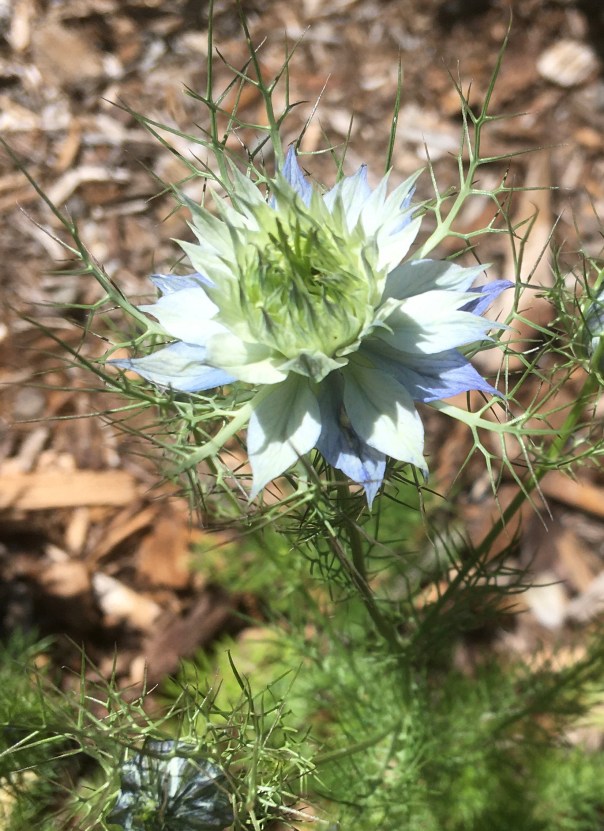 My first Love-in-a-Mist flower bloomed today! This was a Big Event, a project that started off with my longstanding admiration for these flowers, and a desire to grow them myself. It took years, and the donation of seeds from two friends, and then a couple more years, before I got them planted in the greenhouse in the spring. I put them in three different places in the garden, and hope that they will self-sow at least a little and keep themselves going from now on.