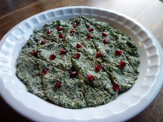 To serve, spread the pkhali on a plate and smooth the top with a spatula. With a knife, make a pattern of diamonds in the top, and sprinkle with pomegranate seeds (or, in a pinch, walnut pieces). Serve with bread.