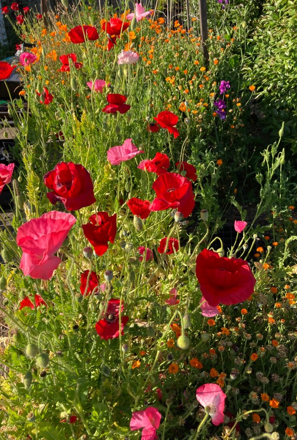 Nearby, dozens of carpenter bees were making a racket in their wild excitement over the largest patch of cerinthe I’ve ever seen, and bright orange California poppies mixed in with the giant red and pink and purple ones. Truly, I experienced the longing that C.S. Lewis describes: