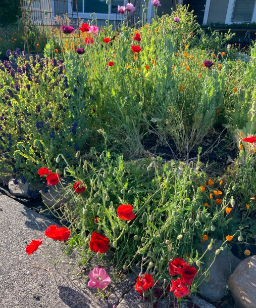 But then — on my way back home I passed by a house with an extravagant poppy display. Oh my, but it was hard to think that my sensing of them was cool. They were swaying in the breeze, and laying themselves down as an offering on the sidewalk. Their colors were warm…. no, hot!