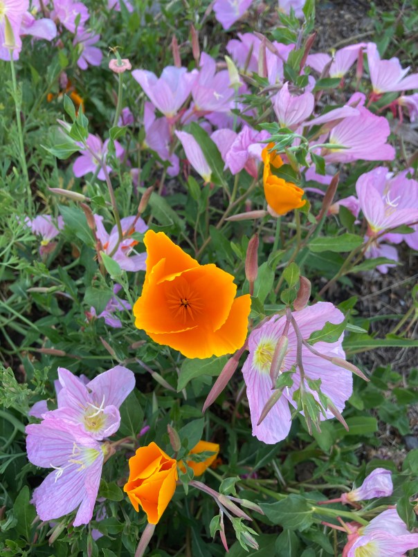 At the corner of my cracked driveway, there my own dear flowers greeted me: the Mexican Evening Primroses, and the California poppies that have only recently added themselves to that display. So I snapped one more picture to detach from the whole landscape and atmosphere to put here flat on the screen. I’m glad you all have enough right brain function to appreciate them such as they are; along with them, I send you my love.