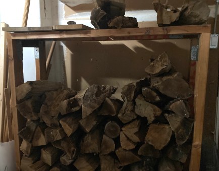 Opposite that rack I have tubs and boxes and bags of kindling and newspapers, a place to split the kindling, and a bucket for collecting ashes. I don’t see how I’m ever going to make room for my car in the garage, which has been a minor goal for a couple of years now. That space serves as my pantry and laundry room and tool shed, and holds all the sorts of things that my daughter Pearl says you have to keep in the garage if you don’t have a basement.