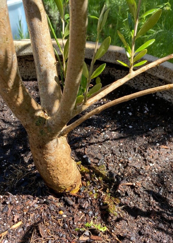 What about the other one? It seems pretty healthy, so I’m putting off dealing with it for now. The two trees have different history. Olive Senior was given to me as a birthday present by my son “Pathfinder” and his family more than ten years ago. I kept it in a roomy pot but didn’t water it very much; its form was lacking but it didn’t occur to me to try to improve on it.