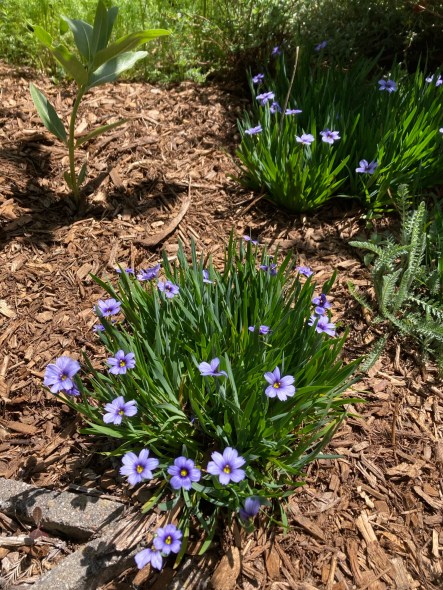 But not quite yet! When I noticed the bee with its head in the lithodora (picture at top), I was mostly looking at the Blue-eyed Grass nearby. It is so sweet it breaks my heart.