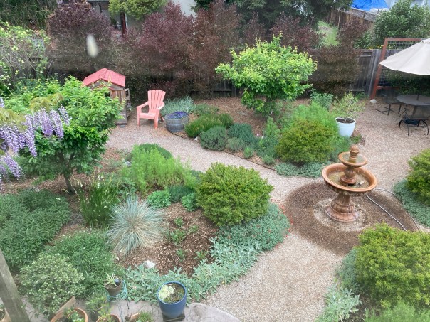 The garden is looking pretty good right now because it’s entering the flowery time of year, and because I’ve had several days to focus on it, to be out there noticing not just little weeds that are easily pulled out of mulch, but this and that glorious scent and sight.