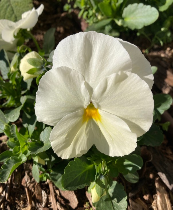 While I wait for the new landscaping to get installed and to grow up, I put in various bulbs and annuals, so that when I go in and out the front door I can be cheered by their colors. I see the leaves of muscari and anemones poking up, but right now it is the wholesome faces of the common pansies that greet me every day. This one is saying hello to you right now.