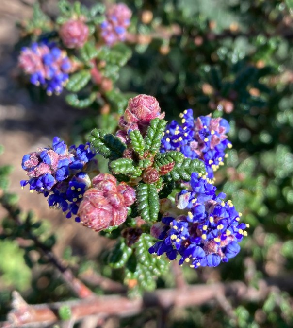 Dan the Landscaper added to the collection of new plants that arrived in nursery pots in November, and quite a few went into the ground last week, including the first-ever ceanothus that has lived on this property. It came with buds, and they are starting to open. Ceanothus is a genus of 50-60 species, sometimes called California Lilac, and I never remember their names, but we had a large one on our former property in another town, “long ago.”