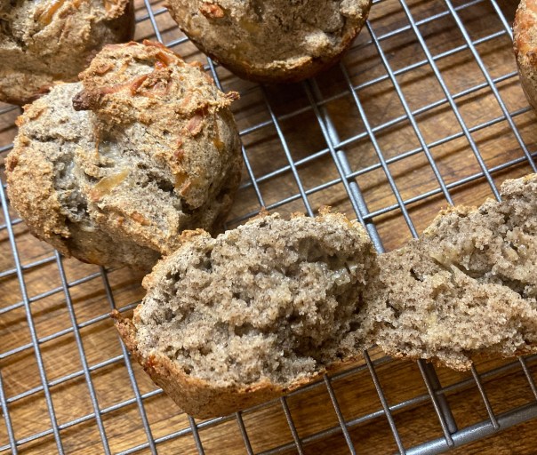 This month I had two occasions when friends visited me for one or two nights, two different friends each time. It was fun to have people to cook for. About an hour before the first pair of guests were to arrive I found out that one of them couldn’t eat the bread I had planned to serve with soup, because of gluten intolerance. I have just enough time to make muffins, I thought, using Bob’s Red Mill gluten-free flour again. I mixed up the wet ingredients, and then — could not find that flour anywhere.