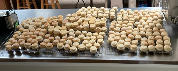 Another type of bread I helped to bake recently was the little prosphora that our parish uses as one type of altar bread at Divine Liturgy. That day we only made these small ones, and two people prepared dough. One of the dough makers used more flour than usual, and we ended up with a record number of prosphora — so while they were cooling I took their picture: