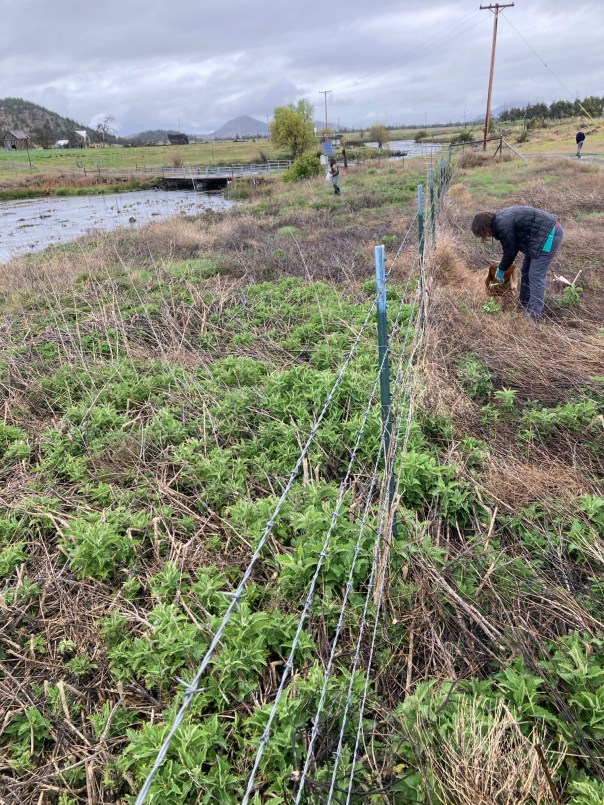 My Forest Family had made Nettle Pasta several times in the past, but I hadn’t been around to experience any of the project, and when I’d seen the pictures I’d been a little jealous. So this time, I was glad to participate. We had to go a distance to find out if the nettles were even at the best stage for using — up the highway for a while, then down a one-lane winding road for a while, then out of the car and on foot through a drizzle. Meadowlarks and red-winged blackbirds were calling under the big and dripping sky as we continued along a gravel road that didn’t have enough gravel — till finally we came to the Shasta River. And there were the nettles in all their robust glory. And they weren’t past their prime at all; they looked perfect.