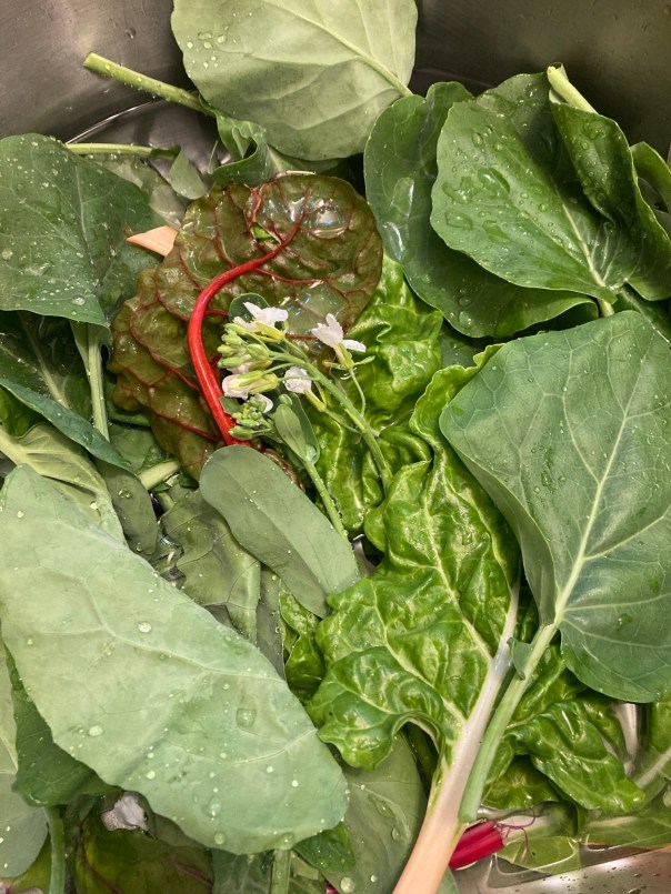 Today I cooked up the first batch of greens from the planting by the driveway. It’s convenient having them growing there, because I notice them at least several days a week when I get in and out of the car. These I picked Saturday morning, and stuck them in the fridge to wait a couple of days. Yum! The flowers are on either the Chinese broccoli or the kalettes; I got them mixed up. But they taste good so they went into the pot, too.