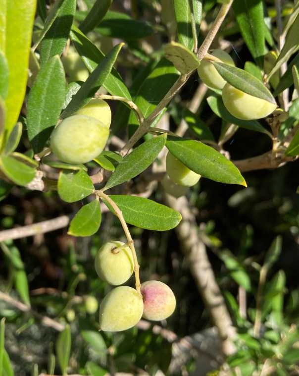 Pathfinder asked me what type of olive I had bought for myself, and I said it started with an “A.” That would be an Arbequina, he told me. And he knew that he had given me a Manzanillo; then he pointed out the different shapes of the olives that are right now on the trees. He knows the Manzanillo, which is this one with pointier fruits: