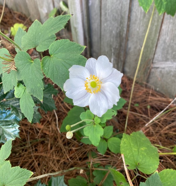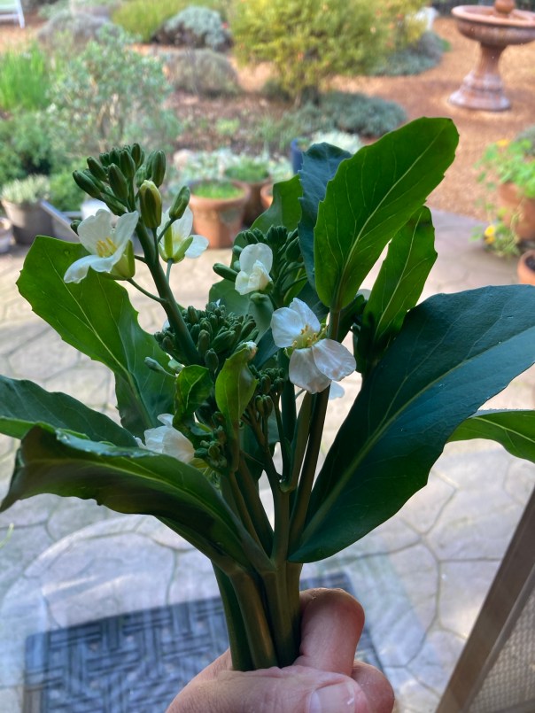 Before I continue with the Christmas theme, I want to show other current floral happenings in house and garden. Blooming orchids, my first picking of Chinese Broccoli, and a last Japanese anemone. The pomegranate bushes are decorating the garden with their changing color.