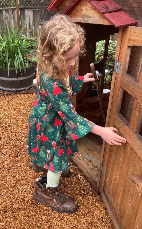 When she was ready to go out and explore my garden and greenhouse, her shoes were in the bedroom where her mom was sleeping, so her father let her use his boots.