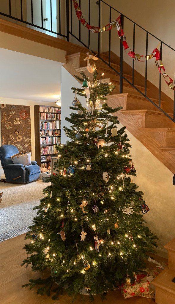 I love my Christmas tree this year! It is a Nordmann fir from Home Depot — amazingly symmetrical and well filled out. Last year the big LED lights I had on my tree were so bright it pained me to look in that direction, so I bought tiny incandescent lights this year and they are perfect.