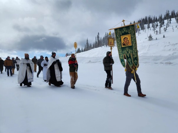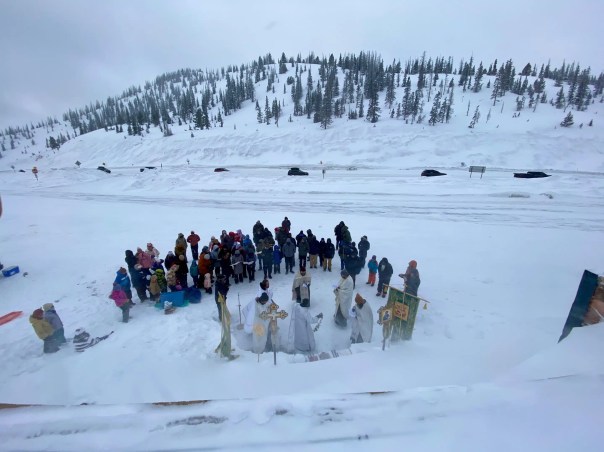 I’ve seen many pictures of holes cut in the ice for this ceremony, but this is the first time I’ve seen its celebration without any liquid H2O at all. Below I will share a few lines from various portions of Orthodox Theophany services, and a few more photos of my brothers and sisters in Colorado.