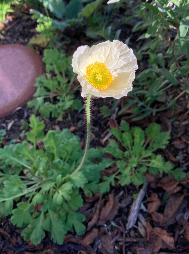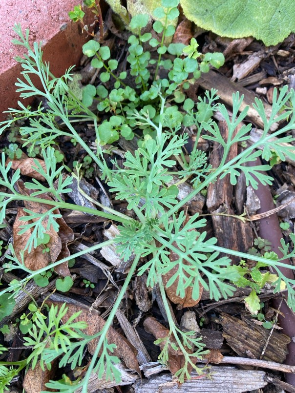 All the weeds are pretty right now, because they are all tiny and fresh-fresh green. I can identify most of the peskiest, which in some cases come from seeds or plants that in past years I encouraged to grow in my garden. From that group the ones that I am now dis-couraging to greater or lesser degree are Love-in-a-Mist (nigella), violas, and California poppies.