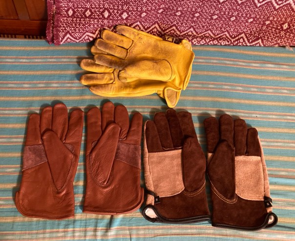 The ones on the left are supple enough and mold to my hands, and I think I’ll use them in the house when dealing with the wood and the stove. The ones on the right are stiffer, but they will be fine for carrying cordwood into the garage or house.