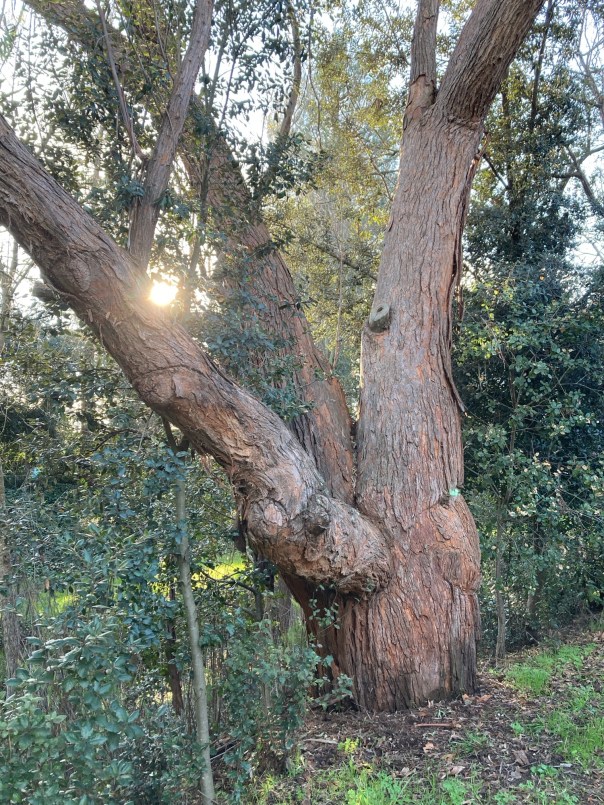 It’s been a week or more since the rains, I can’t keep track, and the creek has quieted down to a silver ribbon. Actually I walk along two different creeks, and cross the bridge where they merge.
