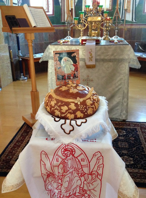 The photo above shows the altar doors as they are now, open all week, with the ceremonial artos bread that stays in that spot throughout this extended (8th) Day. On Thomas Sunday, the week after Pascha, we slice it up and pass it around to all the parishioners. It’s a very special recipe with lots of flavors and ingredients that keep it quite moist all week.