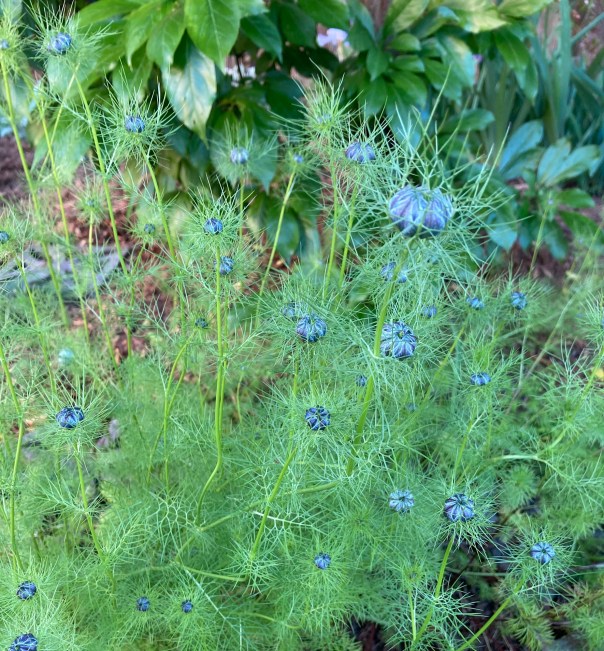 The area by the front door is still somewhat of a hodgepodge, at least while the California poppies and nigella are doing their thing. When they are done it will be a little less crowded, the clary sage (three plants!) will bloom, and that scent will quicken soul and body.