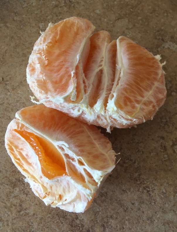 Nancy found a few Sumos remaining from this year’s harvest to give me. They are large for a mandarin orange, seedless, very tasty, and their loose rind makes them super easy to peel.
